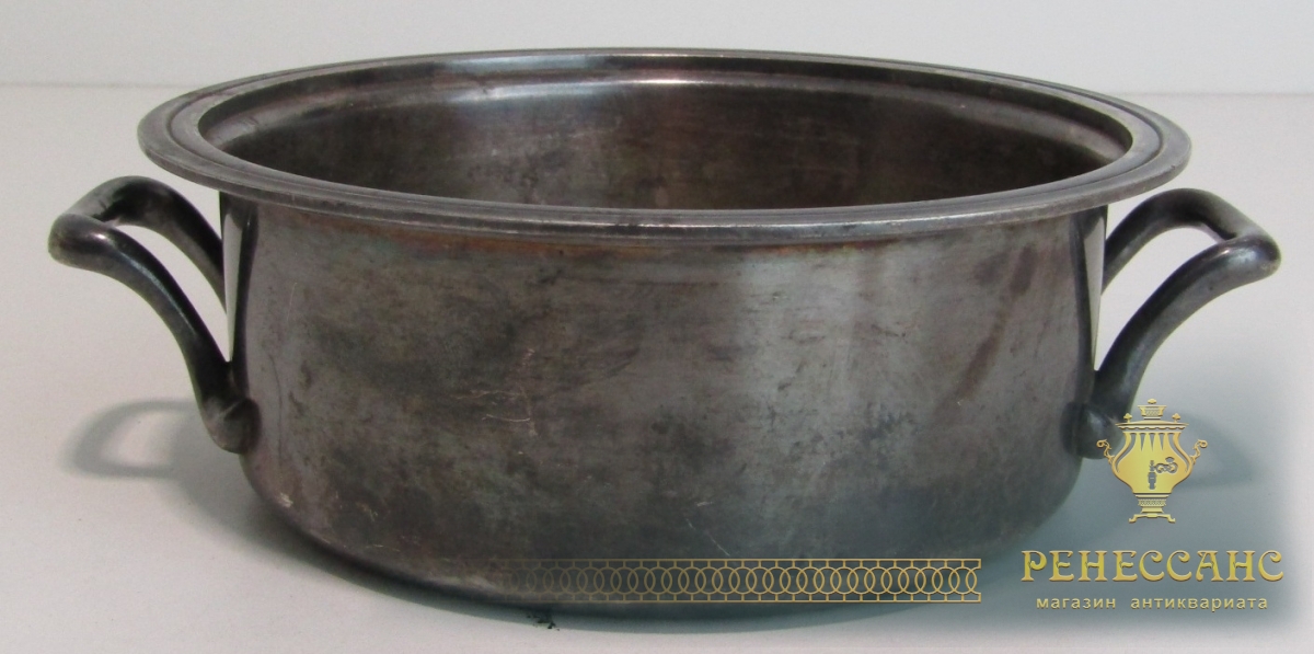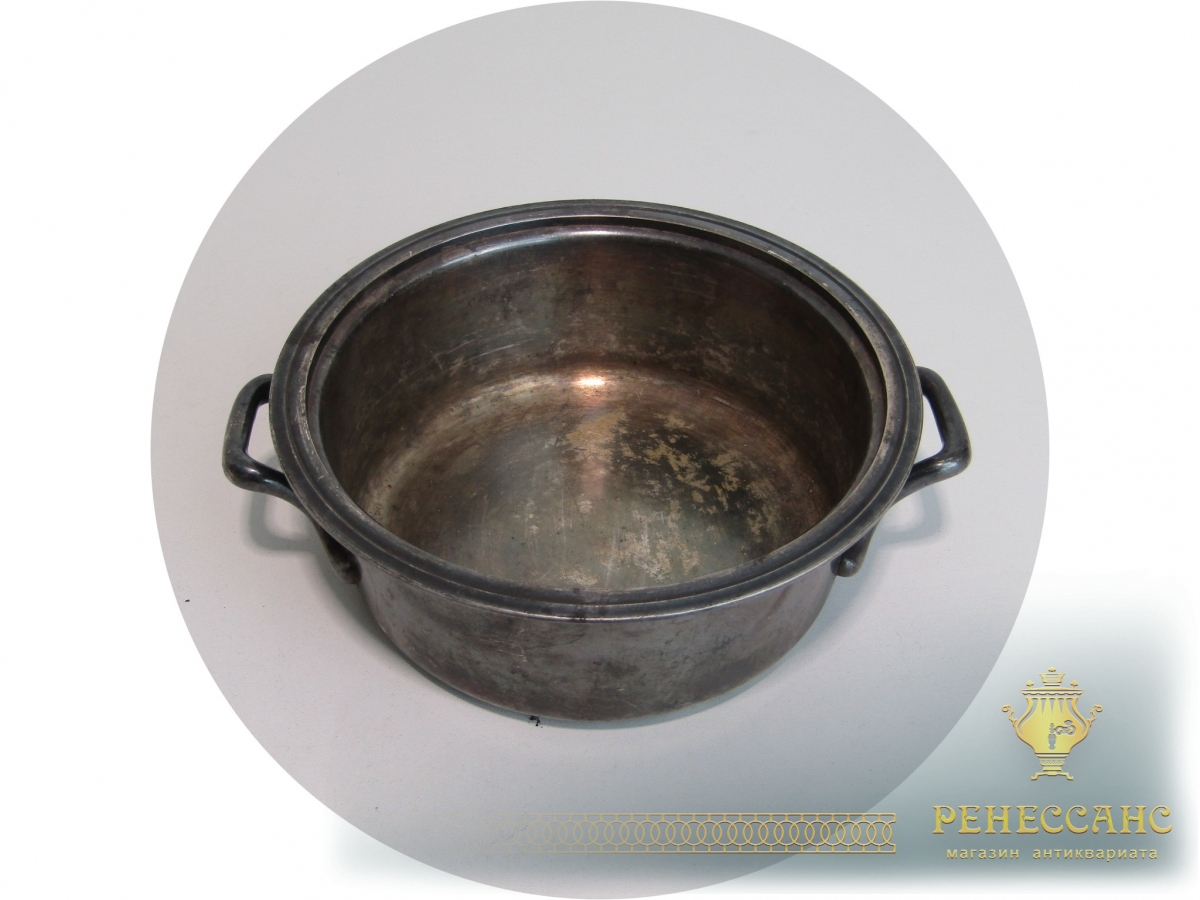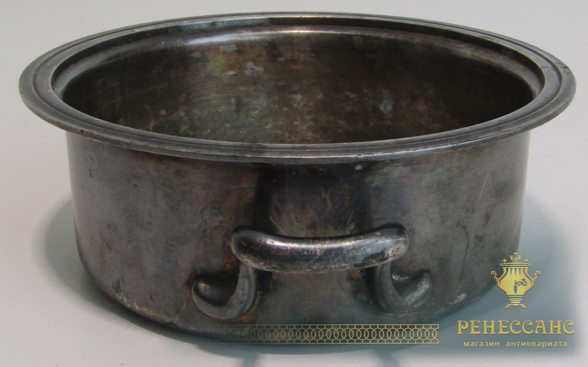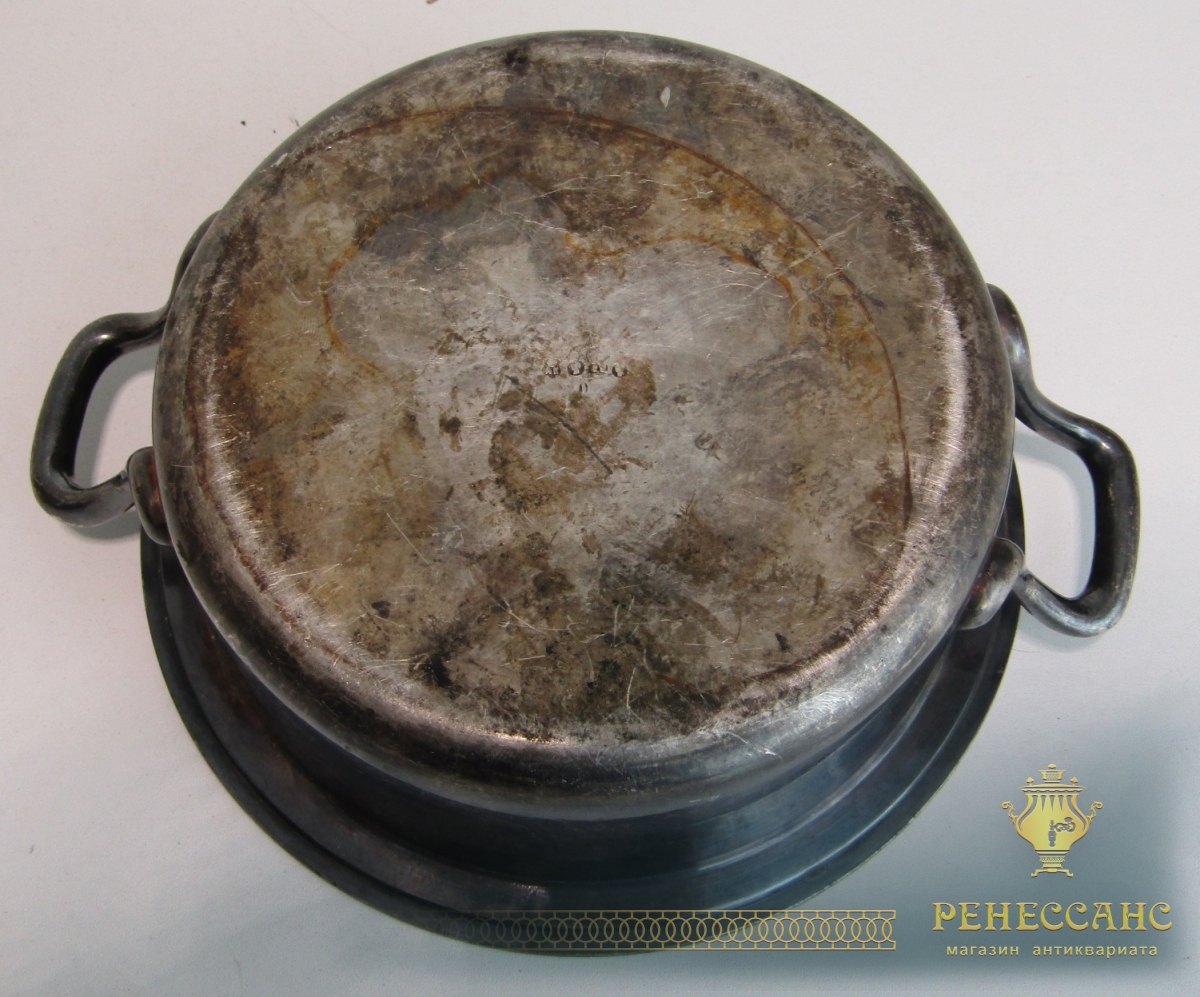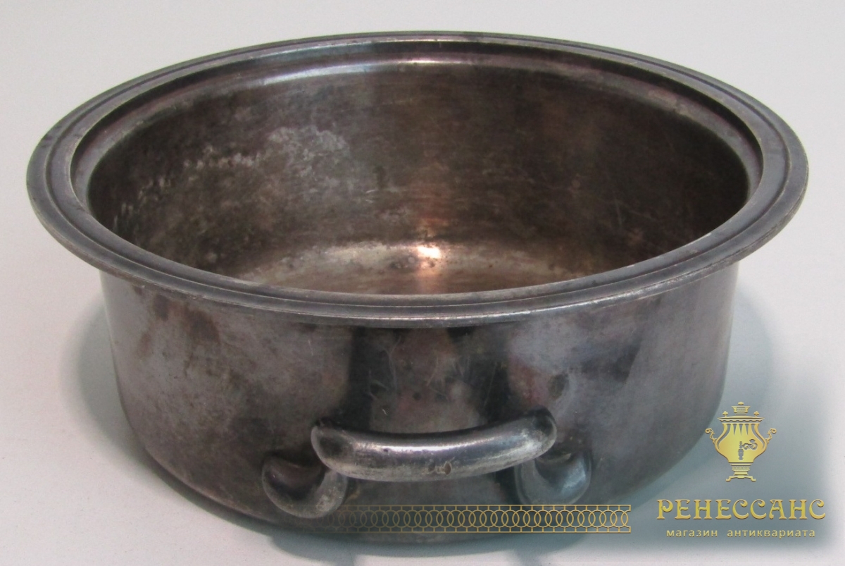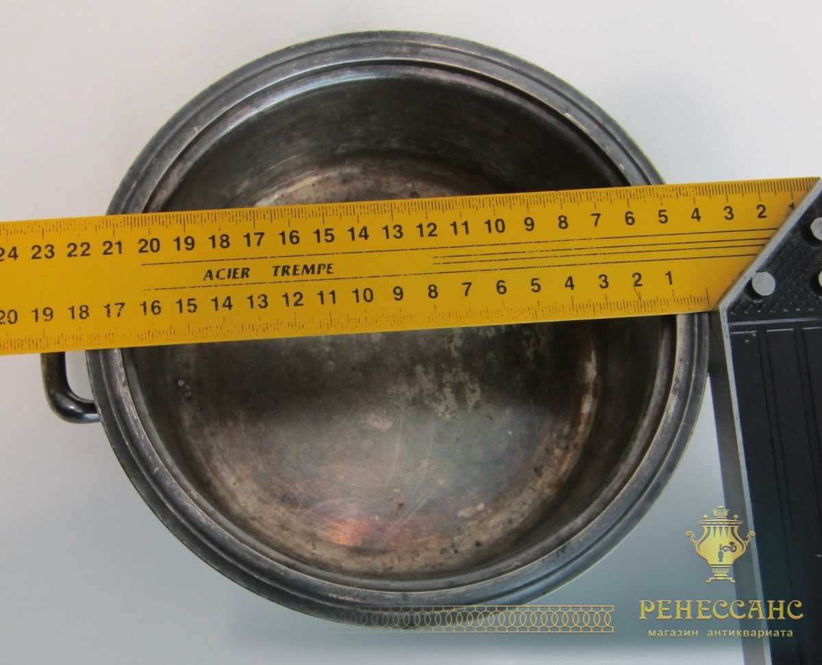 Мельхиор, серебрениеВысота 6,5 см, внешний диаметр 18 см, диаметр под крышку 16 см